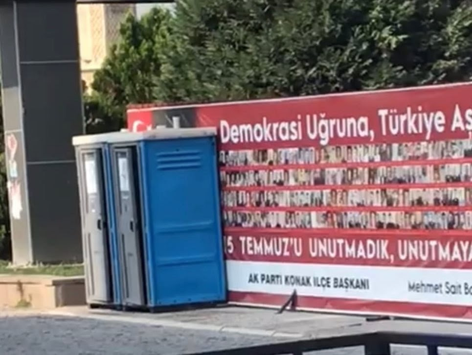 AK Parti Konak İlçe Başkanlığı tarafından, 15 Temmuz şehitleri ile Türkiye Cumhuriyeti’nin kurucusu Mustafa Kemal Atatürk ve Cumhurbaşkanı Recep Tayyip Erdoğan’ın fotoğraflarının olduğu afişin önüne, Atatürk’ün fotoğrafını kapatacak şekilde İzmir Büyükşehir Belediyesi tarafından seyyar tuvalet konuldu. Olaya tepki gösteren AK Parti Konak İlçe Başkanı Sait Başdaş, ‘’Atamıza yapılan saygısızlığa bakın! Gazi Mustafa Kemal Atatürk’ü sevmek, sözde değil özde yaşayan insanlar işidir. Sizi İzmirli hemşehrilerimin vicdanına bırakıyorum!’’ ifadelerini kullandı.
