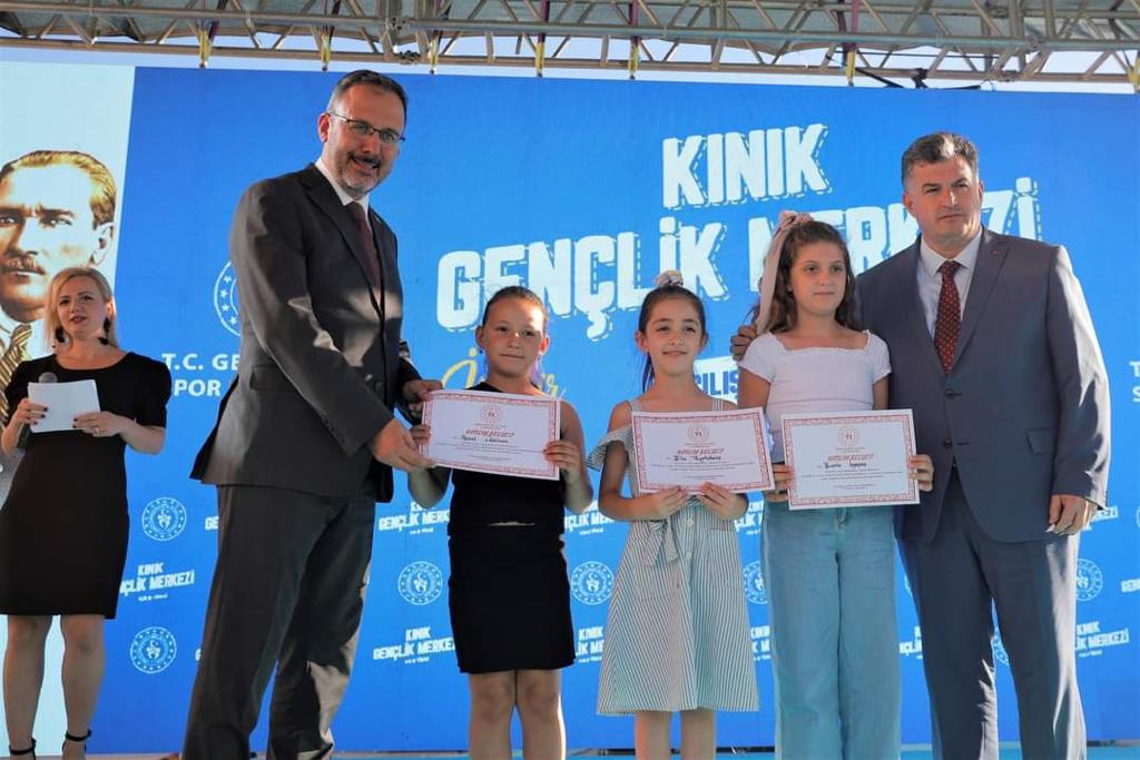 Gençlik merkezinin yapımında emeği geçen herkese teşekkür eden Kasapoğlu, “Kınık’ta yüzme bilmeyen kalmasın” projesi kapsamında yüzmeyi öğrenen 600 öğrenciyi temsilen 3 öğrenciye de katılım belgesi verdi.