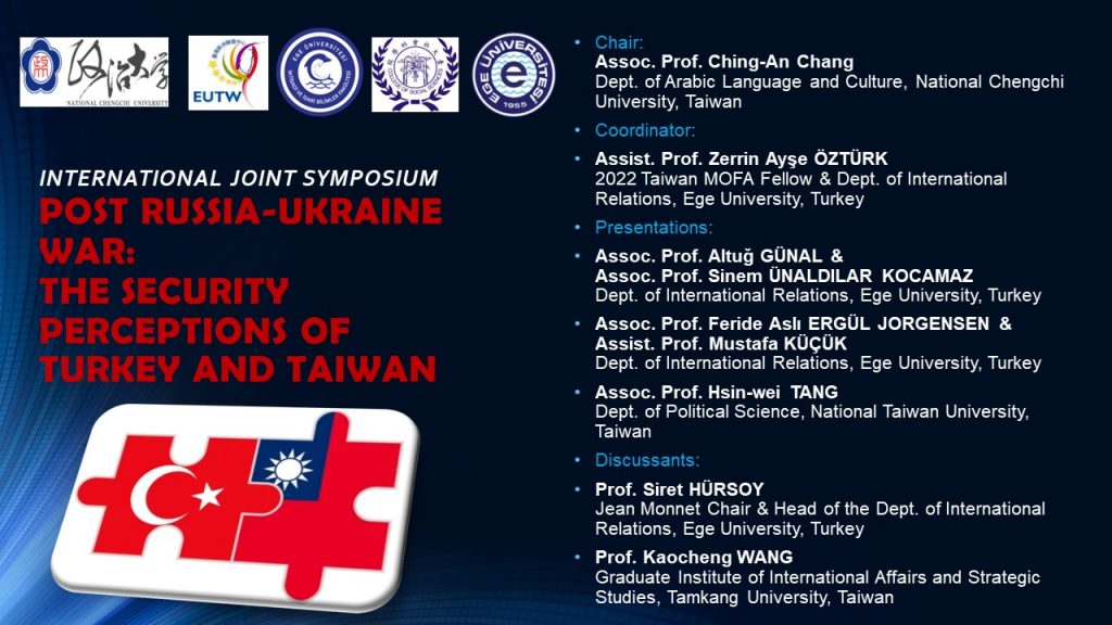 Ege Üniversitesi İktisadi ve İdari Bilimler Fakültesi Uluslararası İlişkiler Bölümü, Ulusal Tayvan Üniversitesi Sosyal Bilimler Fakültesi (The College of Social Sciences of National Taiwan University), Ulusal Chengchi Üniversitesi (National Chengchi University) ve Tayvan AB Merkezi (EUTW) işbirliği ile “Post Russia-Ukraine War: The Security Perceptions of Turkey and Taiwan” (Rusya-Ukrayna Savaşı Sonrası: Türkiye ve Tayvan’ın Güvenlik Algıları) konulu uluslararası sempozyum düzenlenecek.