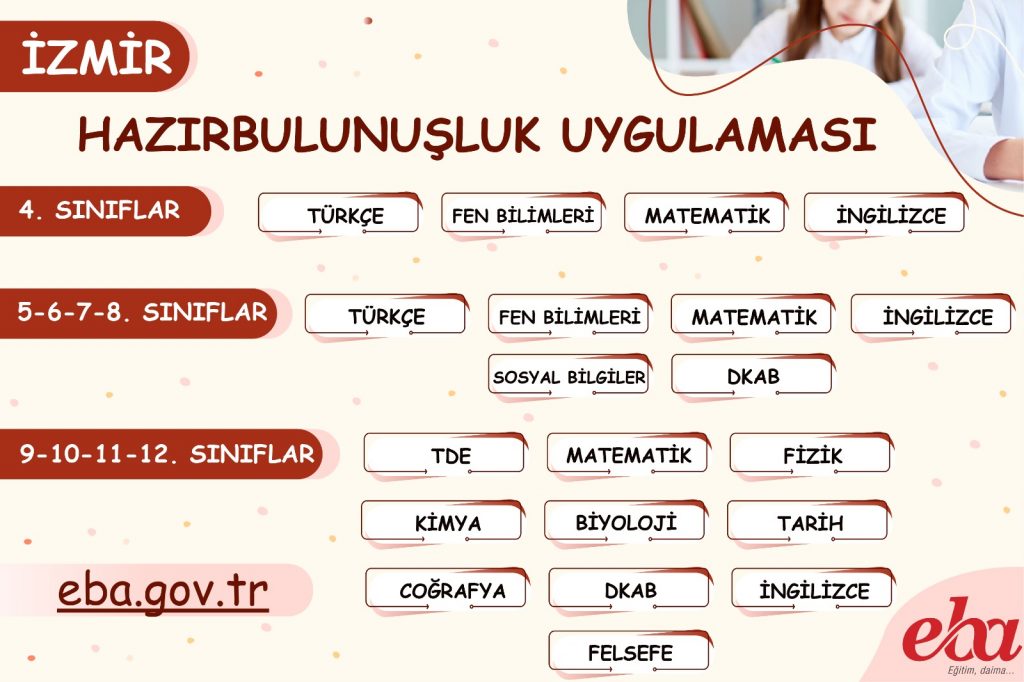 İzmir’de bulunan tüm resmi okullarda uygulanacak olan Hazırbulunuşluk Uygulaması; 4. sınıflarında Türkçe, Matematik, Fen Bilimleri ve İngilizce derslerinden 15’er soru; 5, 6 ve 7. sınıflarında Türkçe, Matematik, Fen Bilimleri, Sosyal Bilgiler, Din Kültürü ve Ahlak Bilgisi, İngilizce derslerinden 15’er soru; 8. Sınıflarında Türkçe, Matematik, Fen Bilimleri, T.C. İnkılap Tarihi ve Atatürkçülük, Din Kültürü ve Ahlak Bilgisi ve İngilizce derslerinden 15’er sorudan oluşuyor.  Liselerin 9 ve 10. sınıflarında Türk Dili ve Edebiyatı, Matematik, Fizik, Kimya, Biyoloji, Tarih, Coğrafya, Din Kültürü ve Ahlak Bilgisi ve İngilizce derslerinden 15’er soru, 11. sınıflarında Türk Dili ve Edebiyatı, Matematik, Fizik, Kimya, Biyoloji, Tarih, Coğrafya, Din Kültürü ve Ahlak Bilgisi, İngilizce ve Felsefe derslerinden 15’er soru, 12. sınıflarında Türk Dili ve Edebiyatı, Matematik (Temel Düzey, İleri Düzey), Fizik, Kimya, Biyoloji, Tarih, Coğrafya, Din Kültürü ve Ahlak Bilgisi ve İngilizce derslerinden 15’er sorudan oluşuyor.  Hazırbulunuşluk Uygulaması 08-09 Ekim 2022 tarihlerinde EBA platformu üzerinden gerçekleştirilecektir.