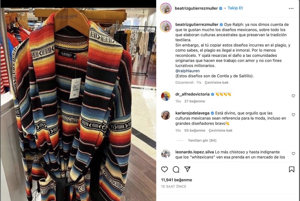 “Hey Ralph: Meksika tasarımlarını, özellikle de tekstil geleneğini koruyan ata kültürlerini yaratanları gerçekten sevdiğinizi fark ettik. Ancak, bu tasarımları kopyalayarak intihal yapıyorsunuz ve bildiğiniz gibi intihal yasadışı ve ahlak dışıdır. En azından kabul et. Umarım bu işi yapan orijinal topluluklara milyon dolarlık karlar için değil, sevgiyle tazminat ödersiniz.”