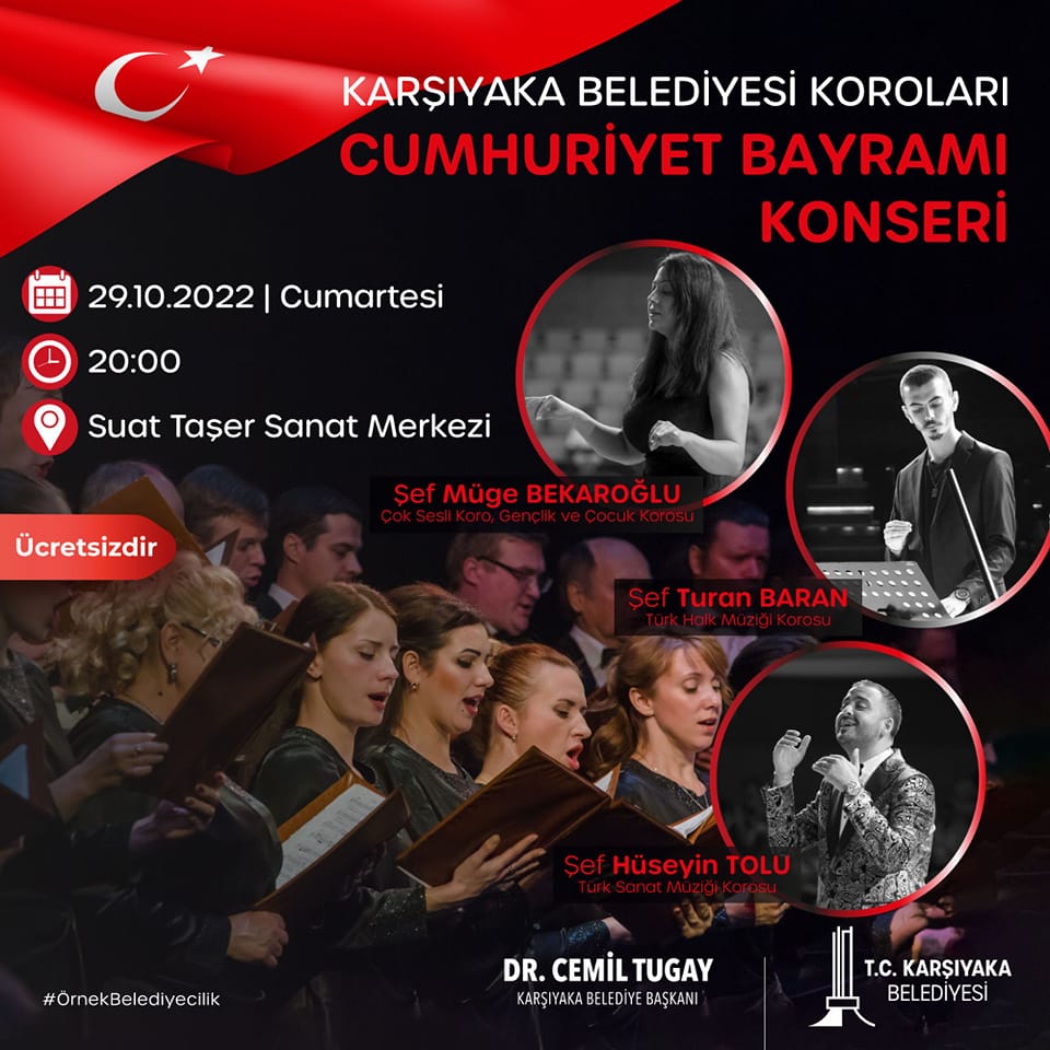 Karşıyaka Belediyesi Başkanı önderliğinde 29 Ekim Cumhuriyet Bayramı kutlamaları kapsamında gerçekleştirilecek Cumhuriyet Korteji ve Karşıyaka Belediyesi Koroları Konseri’ne tüm Halkımızı davet var.
