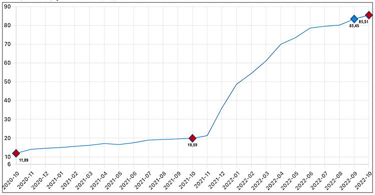 Türkiye İstatistik Kurumu (TÜİK) verilerine göre, Ekim ayında yıllık enflasyon yüzde 85,51, aylık enflasyon ise yüzde 3,45 oldu.