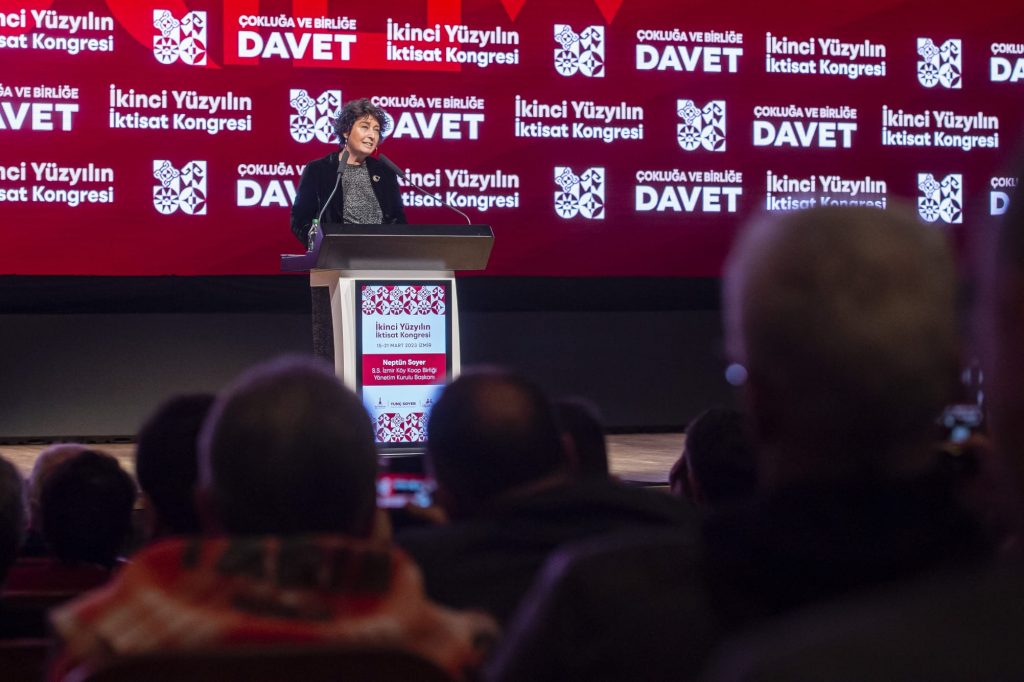İzmir Büyükşehir Belediyesi tarafından düzenlenen İkinci Yüzyılın İktisat Kongresi’nin yedinci ve son gününde konuşan S.S. İzmir Köy Koop Birliği Yönetim Kurulu Başkanı Neptün Soyer, Türkiye’deki kooperatifçiliğin tarihine ilişkin açıklamalar yaptı. Birinci İktisat Kongresi’nden bir asır sonra üreticilerin söz haklarını kullanmış olmalarına vurgu yapan Soyer, “100 yıl sonra tekrar burada bizim de bir sözümüzün olması bizi çok gururlandırdı” dedi.