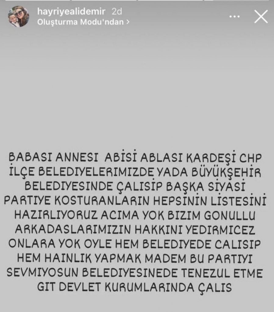 İzmir Büyükşehir Belediyesinde görevli Menemen CHP üyesi Hayriye Çelik’in sosyal medya hesabında “Acıma yok” diyerek belediyede CHP’ye oy vermeyenlerin listesini yaptıklarını belirttiği sosyal medya paylaşımına bir sert tepki de AK Parti Gençlik Kolları Genel Başkanı ve İzmir Milletvekili Eyyüp Kadir İnan’dan geldi. Hayriye Çelik’in sosyal medyada yaptığı açıklamayı paylaşan İnan, şu ifadelere yer verdi, ‘’CHP seçim mağlubiyetinden ders çıkarmak yerine, milletle zıtlaşmaya devam ediyor. Ailesinde AK Partiye oy vermiş olan belediye çalışanlarını işten çıkarmaya karar vermişler. Mağduriyet yaşayan tüm belediye personelinin hukuk mücadelelerinde yanlarında olmaya hazırız.’’