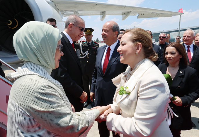 Recep Tayip Erdoğan, 28 Mayıs seçiminde bir kez daha Cumhurbaşkanı seçilmesinin ardından ilk yurt dışı ziyaretini KKTC’ye gerçekleştiriyor. İlk ziyareti kapsamında KKTC’nin başkenti Lefkoşa’da bulunan Ercan Havalimanı’na TSİ 13.10 sıralarında inen Cumhurbaşkan’ı Erdoğan’ı KKTC Cumhurbaşkanı Ersin Tatar karşıladı.Başkan Erdoğan, önce karşılamaya katılan KKTC heyeti ile tek tek tokalaştı ardından da karşılama kıtasını selamladı.