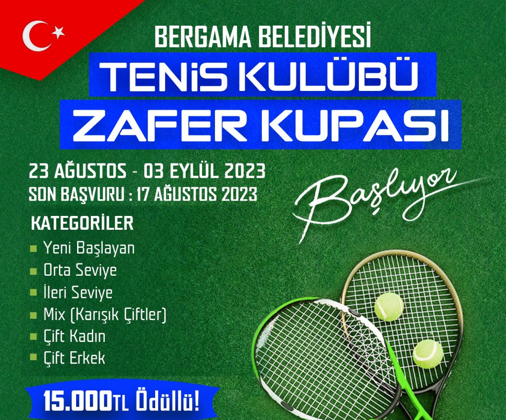 Bergama Belediye’sinin “Her yaşta her branşta spor” sloganıyla başlattığı spor kursları ve etkinliklere bir yenisi daha ekleniyor. 23 Ağustos – 3 Eylül tarihleri arasında yapılacak turnuvaya 6 farklı kategoriden başvuru yapılabiliyor. Yeni Başlayan, Orta Seviye, İleri Seviye, Mix (Karışık Çiftler) Çift Kadın ve Çift Erkek kategorilerinden yapılacak başvuruda toplam ödül 15 bin TL olarak belirlendi