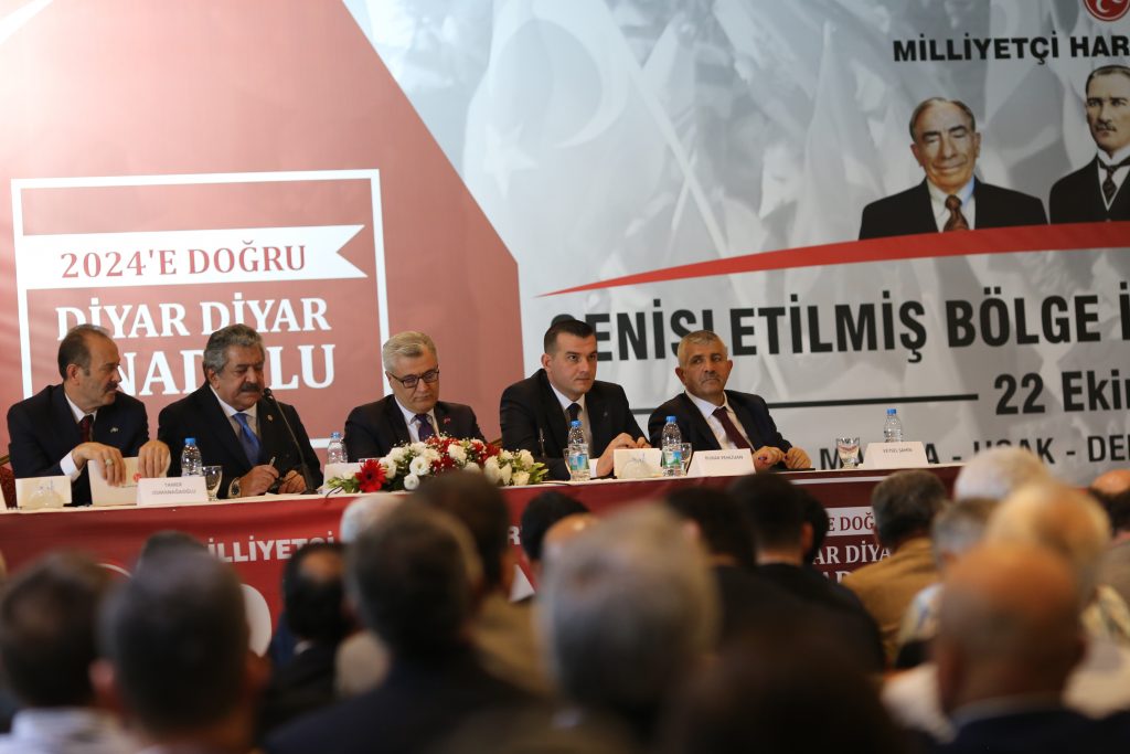 Milliyetçi Hareket Partisi (MHP) Genel Başkanı Devlet Bahçeli talimatlarıyla gerçekleştirilen “Diyar Diyar Anadolu Genişletilmiş Bölge İstişare Toplantısı” İzmir İl Başkanlığının ev sahipliğinde Balçova Termal Tesisleri Kardelen Salonu’nda gerçekleştirildi. Manisa, Aydın, Denizli, Uşak, Muğla ve Burdur İl Teşkilatlarının katılımıyla gerçekleştirilen toplantıya Genel Başkan Yardımcısı Fethi Yıldız Başkalık etti. MHP’nin TBMM Grup Başkan Vekili ve Manisa Milletvekili Erkan Akçay, Genel Sekreter Yardımcısı ve İzmir Milletvekili Tamer Osmanağaoğlu ve Genel Sekreter Yardımcısı Bahadır Bumin Özarslan da toplantı divanında yer alan isimlerdi. Toplantının açılış konuşmasını İzmir İl Başkanı Veysel Şahin yaparken Manisa Büyükşehir Belediye Başkanı Cengiz Ergün partililere hitap edenler arasındaydı.