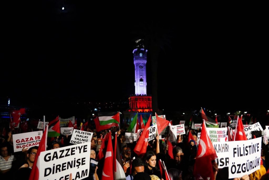 Sivil Toplum Kuruluşları Platformu ve Milli İrade Platformu tarafından Konak saat kulesi meydan’ında Filistin’e destek mitingi düzenlendi. Meydan’da bir araya gelen yüzlerce insan İzmir’den dev kalabalık gür bir ses, tek bir yumruk olarak Filistin’de yaşanan insanlık dramına karşı tepkilerini dile getirdirildi.
