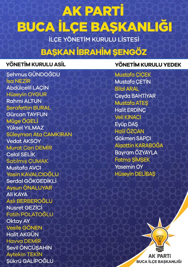 AK Parti Buca İlçe yeni Yönetim Kurulu, İbrahim Şengöz başkanlığında şu isimlerden oluşuyor: