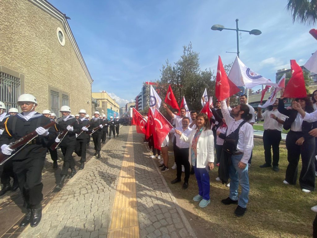 İl protokolünün yer aldığı kutlamaların akabinde gerçekleşen geçit törenine, İzmir Demokrasi Üniversitesi Rektörü Prof. Dr. Bedriye TUNÇSİPER, Rektör Yardımcısı Prof. Dr. Berna Dirim Mete, üniversitenin öğretim üyeleri ve İzmir Demokrasi Üniversitesini temsilen farklı bölümlerden seçilen 50 öğrenci katıldı.