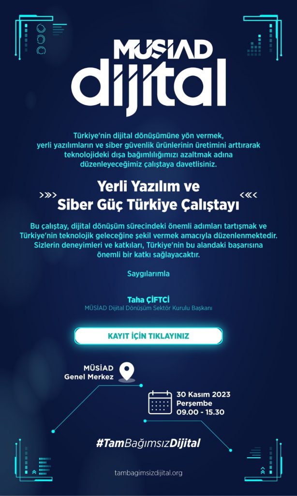 Çalıştay hakkında konuşan MÜSİAD Dijital Dönüşüm Sektör Kurulu Başkanı Taha Çiftci amaçlarını şöyle anlattı: “Bu çalıştay, dijital dönüşüm sürecindeki önemli adımları tartışmak ve Türkiye’nin teknolojik geleceğine şekil vermek amacıyla düzenlenmektedir.  Türkiye’nin dijital dönüşümüne yön vermek, yerli yazılımların ve siber güvenlik ürünlerinin üretimini arttırarak teknolojideki dışa bağımlılığımızı azaltmakadına düzenleyeceğimiz çalıştaya sektörün tüm paydaşlarını bekliyoruz.”