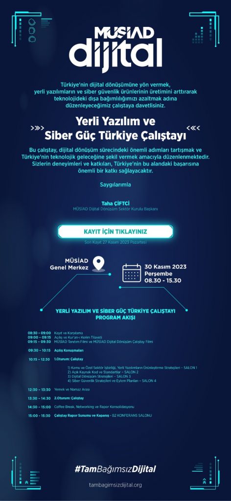 “Türkiye’nin dijital dönüşümüne yönvermek, yerli yazılımların ve siber güvenlik ürünlerinin üretimini arttırarak teknolojideki dışa bağımlılığımızı azaltmak adına düzenleyeceğimiz çalıştaya sektörün tüm paydaşlarını bekliyoruz.”