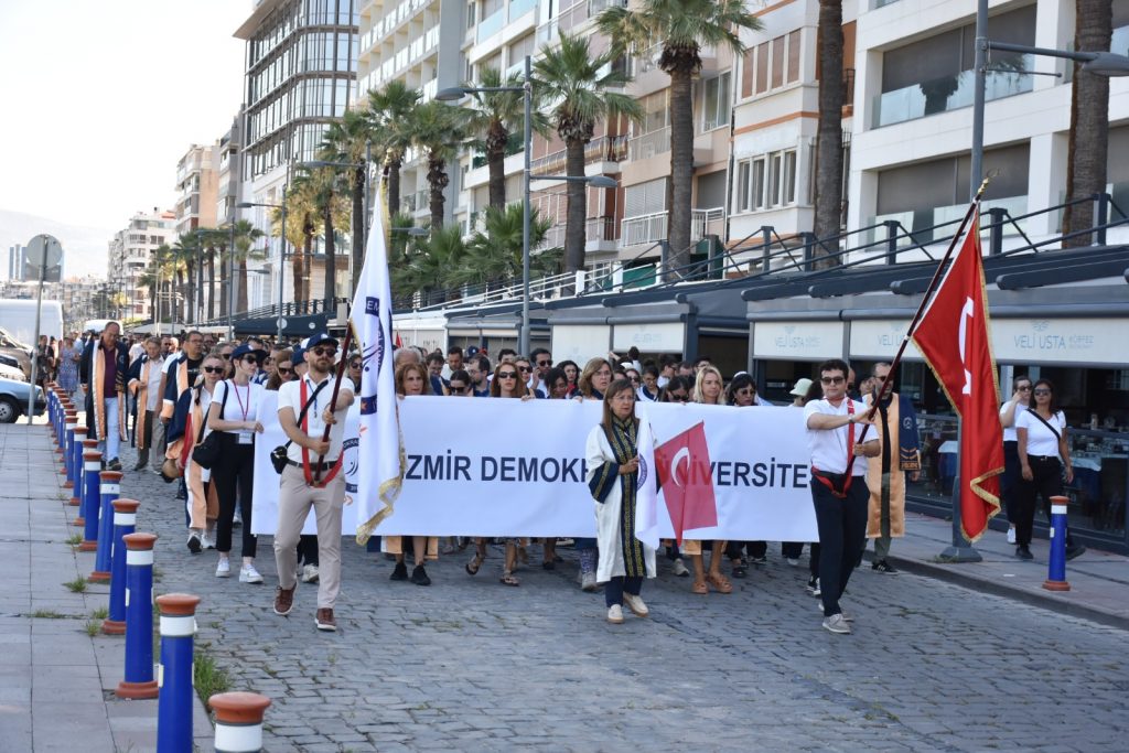 İzmir Demokrasi Üniversitesi akademik ve idari personeli “15 Temmuz Demokrasi ve Milli Birlik Günü” anma etkinliklerinde bir araya gelerek geleneksel hale getirdikleri “Demokrasi Yürüyüşü”nün 7.sini gerçekleştirdi. Resmi tatil olmasına rağmen 15 Temmuz’un yıl dönümünde tatil yapmayan İzmir Demokrasi Üniversitesi personeli, Rektör Prof. Dr. Bedriye Tunçsiper’in önderliğinde 7 yıldır Gündoğdu Meydanı’ndan Cumhuriyet Meydanı’na “Demokrasi Yürüyüşü” yapıyor. Üniversite ayrıca bu anlamlı günü her yıl anma etkinlikleriyle geçiriyor.