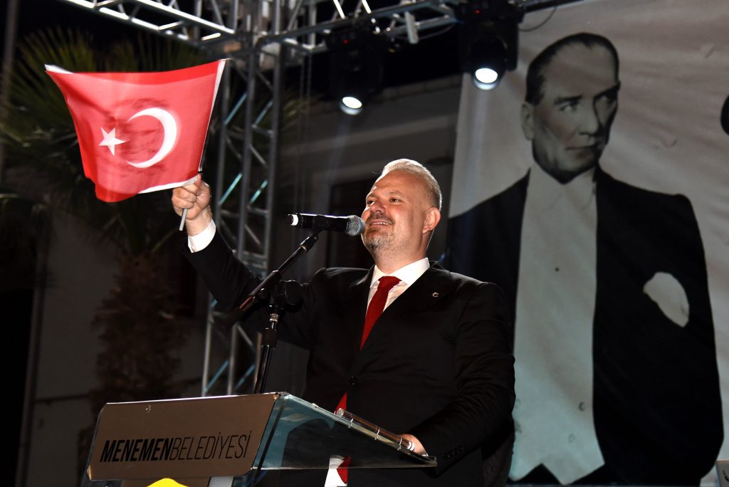 Saat 19.00’da Menemen İlçe Stadı’nda başlayacak bu anlamlı gecede, Cumhuriyet Bayramı kortejimizde yan yana olmaya, yüreklerimizde Cumhuriyetimizin gücünü hissetmeye davet ediyoruz. Ay-yıldızlı bayraklarımızla, marşlarımızla Cumhuriyet’in tüm kazanımlarını hep birlikte haykıralım” diye konuştu.