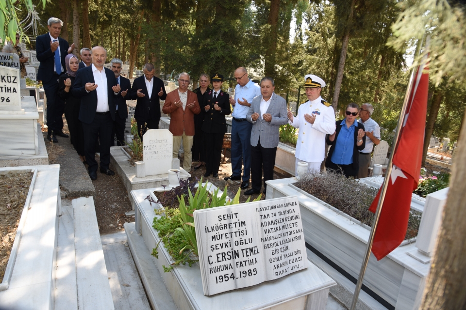 Karşıyaka Örnekköy’deki şehit mezarlıklarına düzenlenen ziyarette Karşıyaka Kaymakamı Özkan Demir, Ege Deniz Bölge Komutanı Deniz Kıdemli Albay Tamay Durğun, Karşıyaka Cumhuriyet Başsavcısı Halil Sezgin, İlçe Müftüsü Hayri Cihangeri, İlçe Jandarma Komutanı Büşra Koçak, İlçe Emniyet Müdürü Ercan Kaçanoğlu, İlçe Milli Eğitim Müdürü Arzu Günaydın, İlçe Nüfus Müdürü Ertuğrul Öcek, İlçe Sağlık Müdürü Dr. Şamil Buğa, Sosyal Hizmetler Müdürü Servet Çekiç, Sosyal Yardımlaşma Vakfı Müdürü Bora Kaya, İlçe Tarım Müdürü Özgür Tağızade, AK Parti Karşıyaka İlçe Başkanı Selahattin Köse, MHP İlçe Başkan Yardımcısı Erdoğan Karaboğa, Örnekköy Mahalle Muhtarı Avni Yüksel, okul müdürleri, imamlar ve kamu kurumlarının yöneticileri katıldı.
